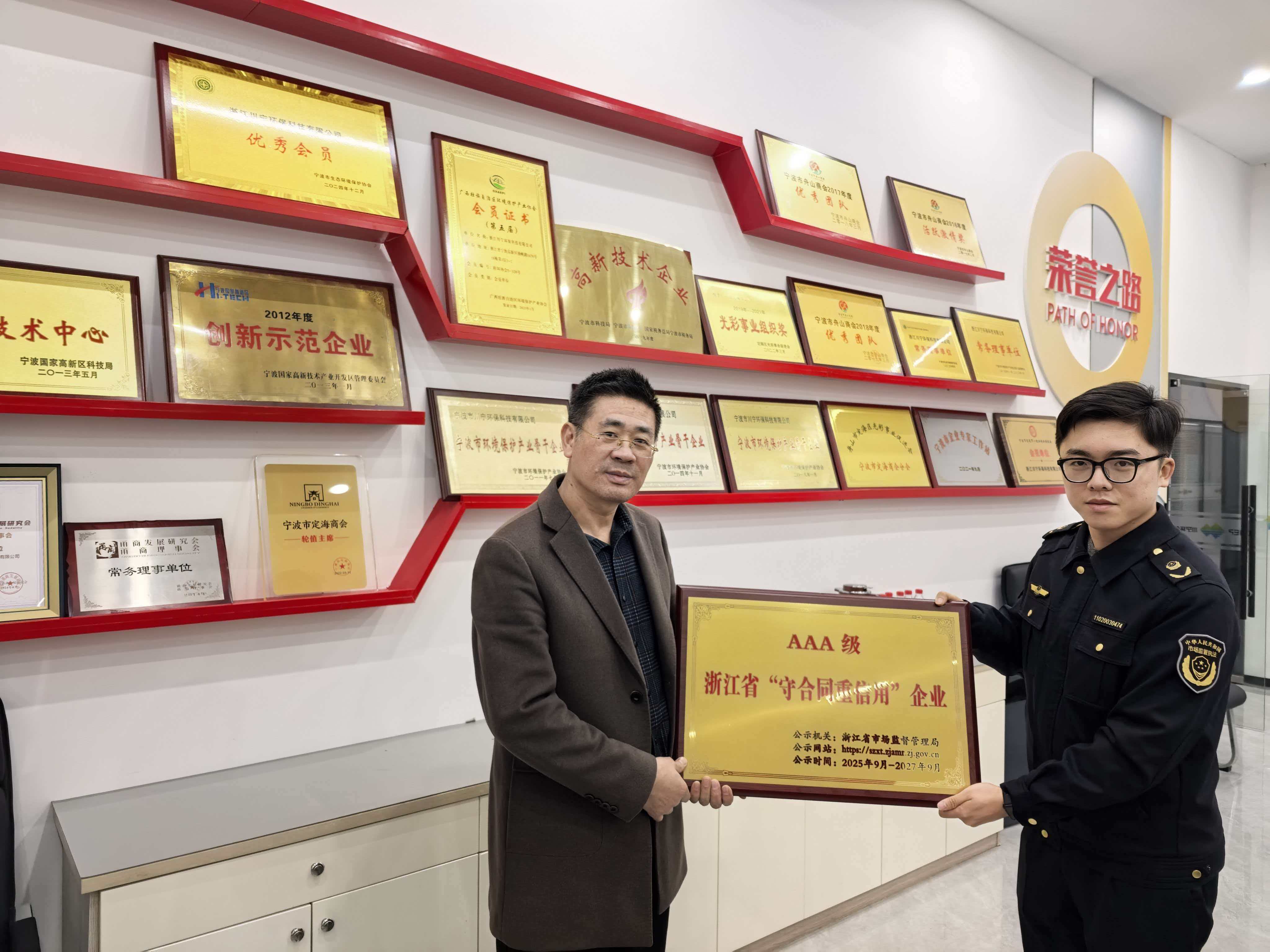 12月24日,寧波市高新區(qū)市場(chǎng)監(jiān)督管理局領(lǐng)導(dǎo)蒞臨浙江川寧環(huán)??萍加邢薰?,向我司頒發(fā)—浙江省AAA級(jí)“守合同重信用”榮譽(yù)牌匾。